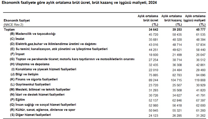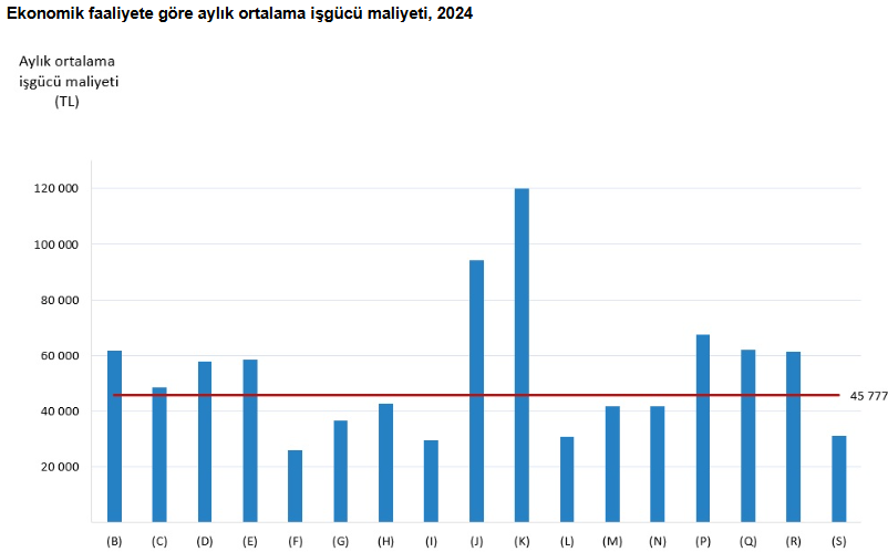 İstihdam edilenlerin işverene toplam maliyetini ve bu maliyet unsurlarının toplam içindeki dağılımını ortaya koymak amacıyla üretilen istatistiklere göre geçen yıl aylık ortalama iş gücü maliyeti 45 bin 777 lira oldu.